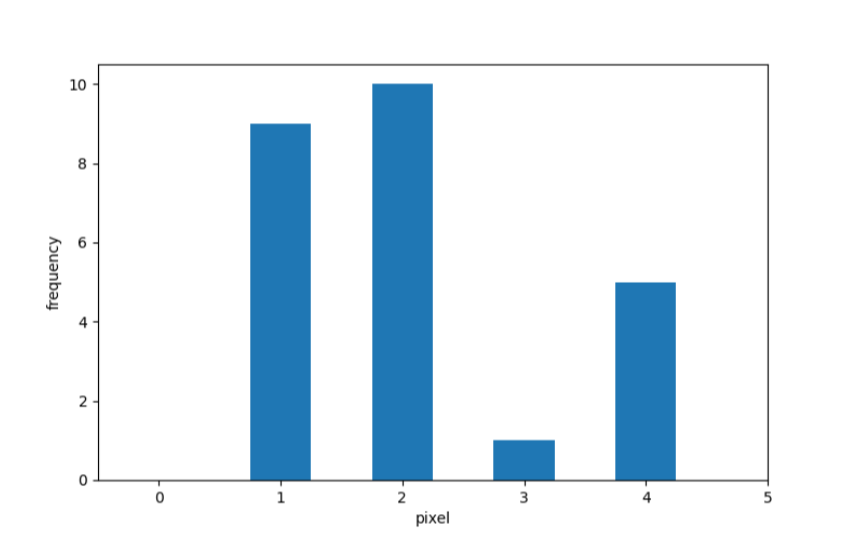 간단한 예시를 들어 아래와 같은 5x5 내부에 픽셀 값이 그림과 같을 때, 우측과 같이 히스토그램을 그릴 수 있다.